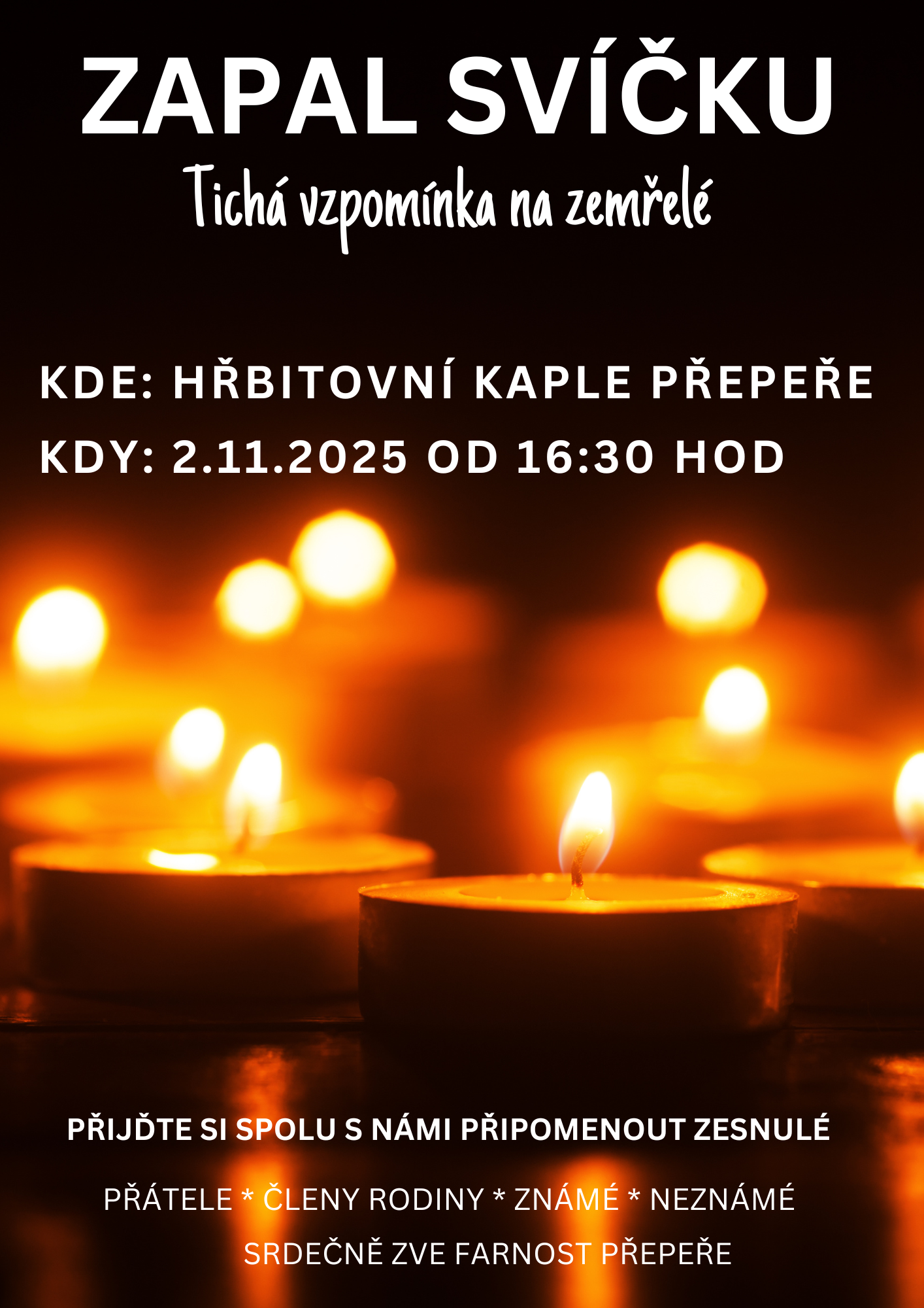 V neděli 2.11.2025 od 16,30 u hřbitovní kaple v Přepeřích se koná setkání se vzpomínkou na naše zemřelé. Farnost Přepeře srdečně zve veřejnost k účasti.